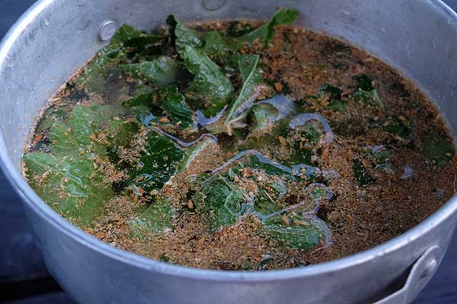 - On the trail: Put your greens (I like hogweed but stinging nettles are also easy to find) and dried mushrooms into 1 cup/240ml of water. If using jerky, put it in the water too.