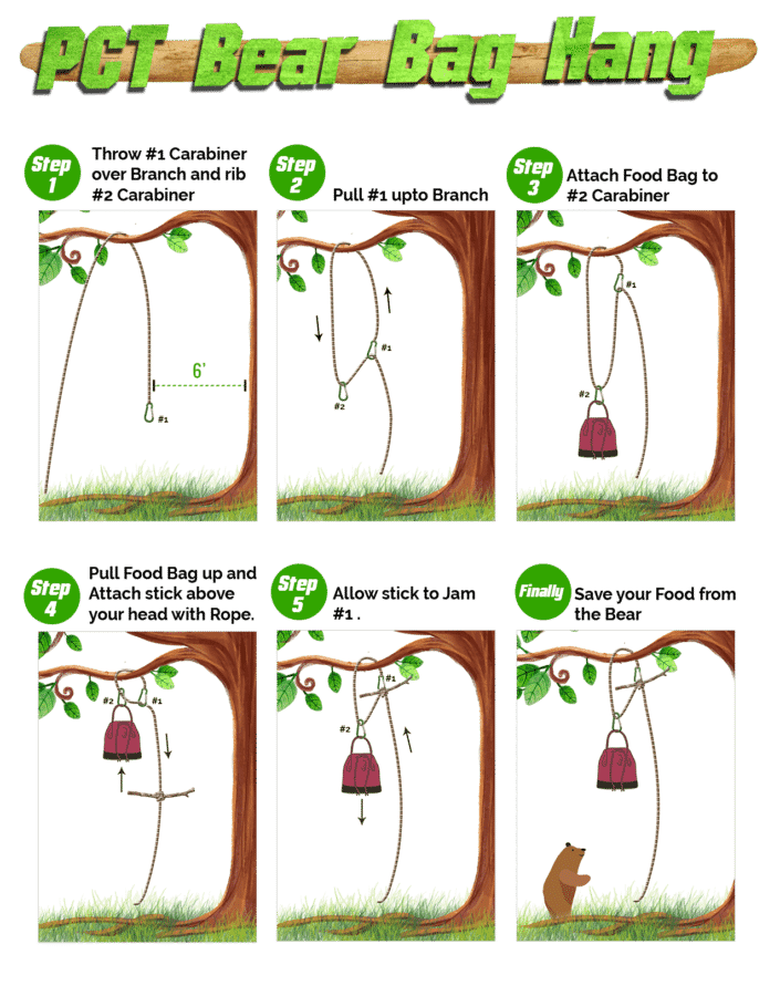Also called a “bear bag,” this storage method involves hanging food between trees or off of a tree branch in a way that makes it difficult for bears to get. There are several methods of bear hangs, though the PCT method is considered best. Bears are incredibly smart creatures and have learned how to cut rope to make food fall!